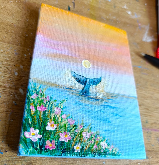 手のひらサイズのミニ原画(10センチ×7センチ)です。アクリル絵具とキャンバスを使用しています。作品表面はニスでコーティングしています。