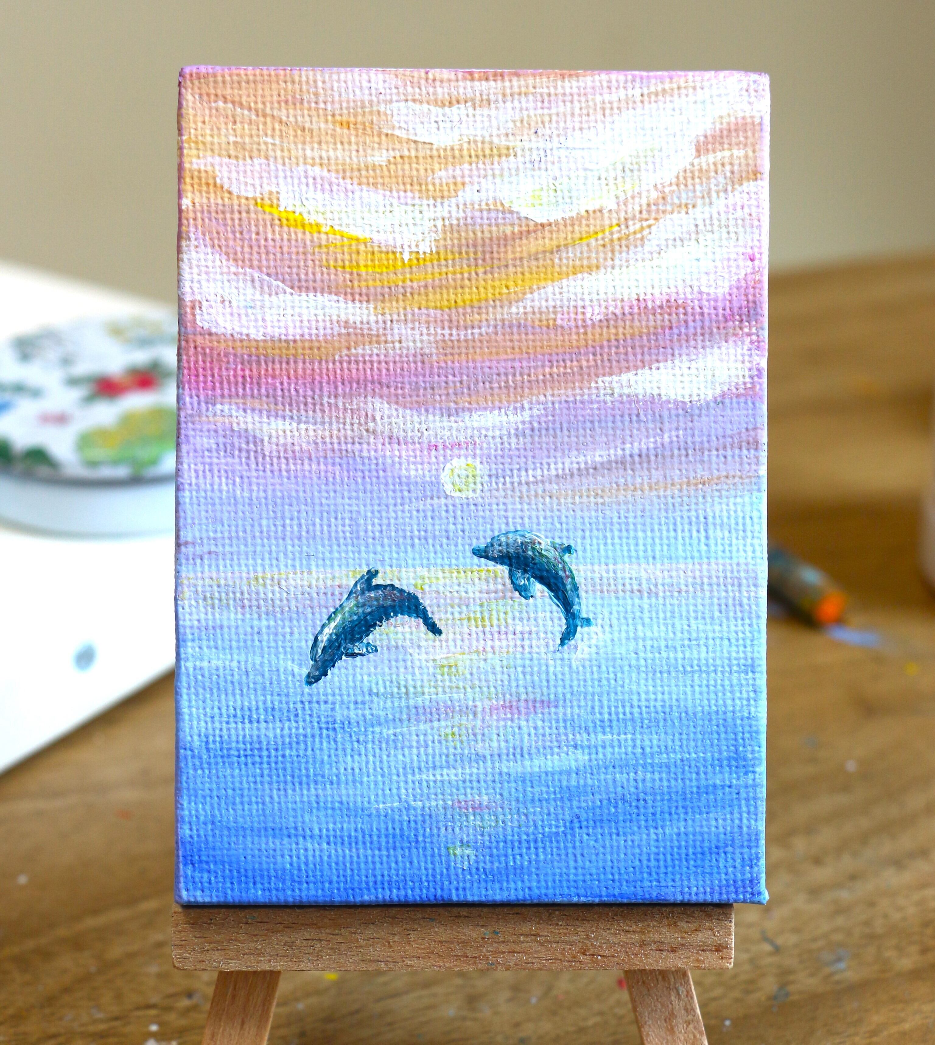 手のひらサイズのミニ原画(10センチ×7センチ)です。アクリル絵具とキャンバスを使用しています。作品表面はニスでコーティングしています。