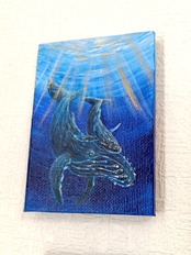 手のひらサイズのミニ原画(10センチ×7センチ)です。アクリル絵具とキャンバスを使用しています。作品表面はニスでコーティングしています。