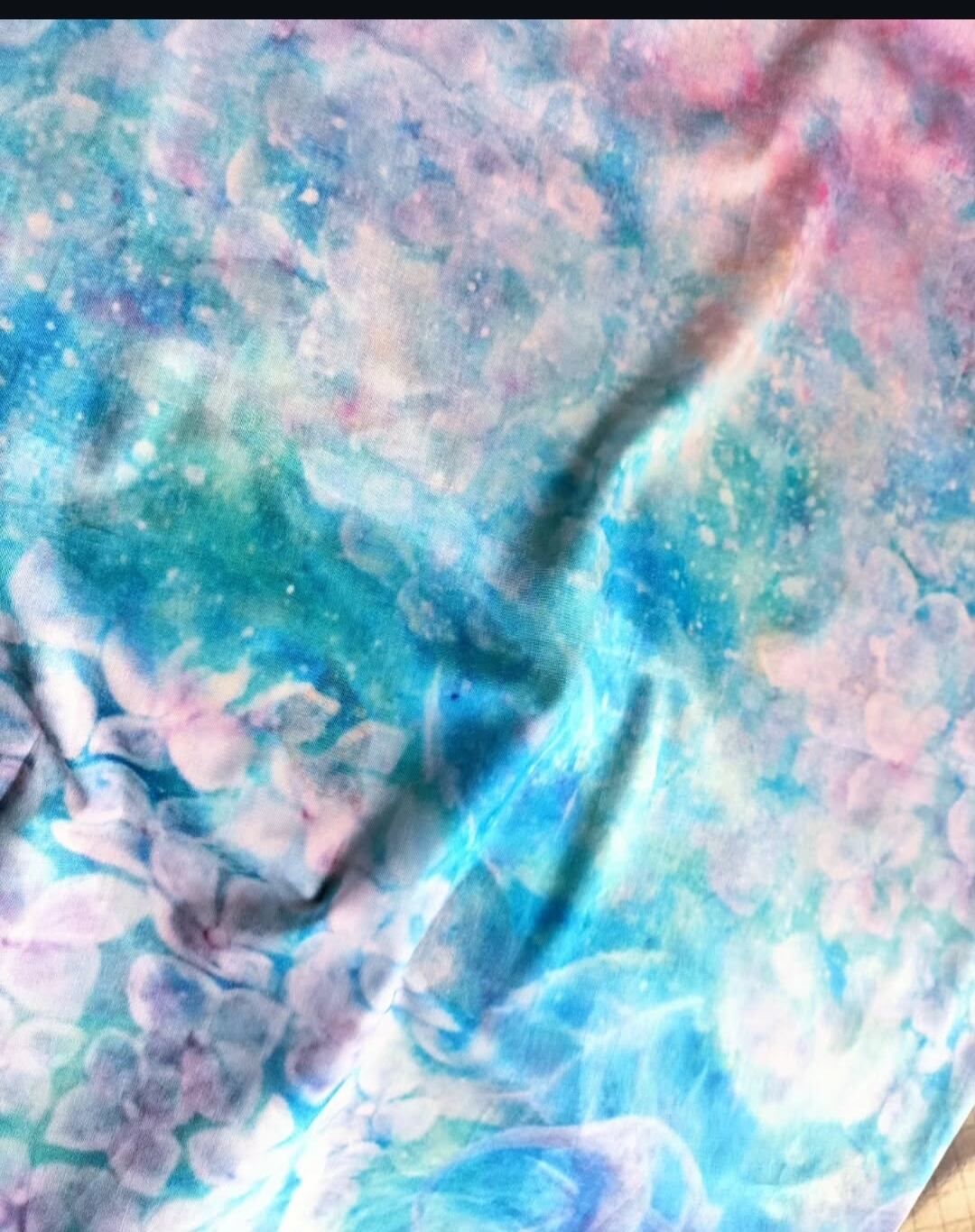 「作品:紫陽花とツノダシ」は暖色系と寒色系の色合いが混じり合った淡い色合いの紫陽花とその周りを泳ぐツノダシを描いた作品です。