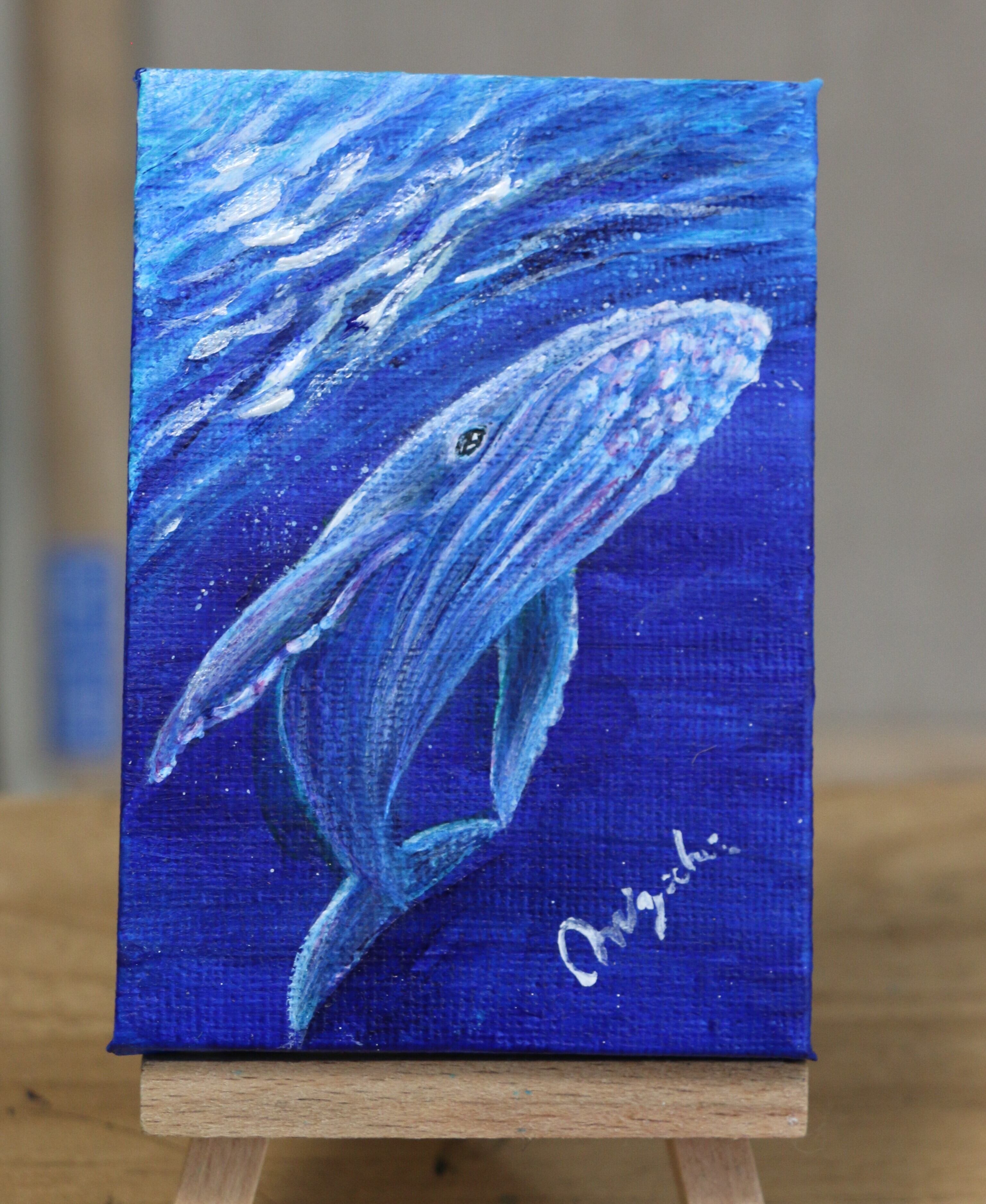 手のひらサイズのミニ原画(10センチ×7センチ)です。アクリル絵具とキャンバスを使用しています。作品表面はニスでコーティングしています。