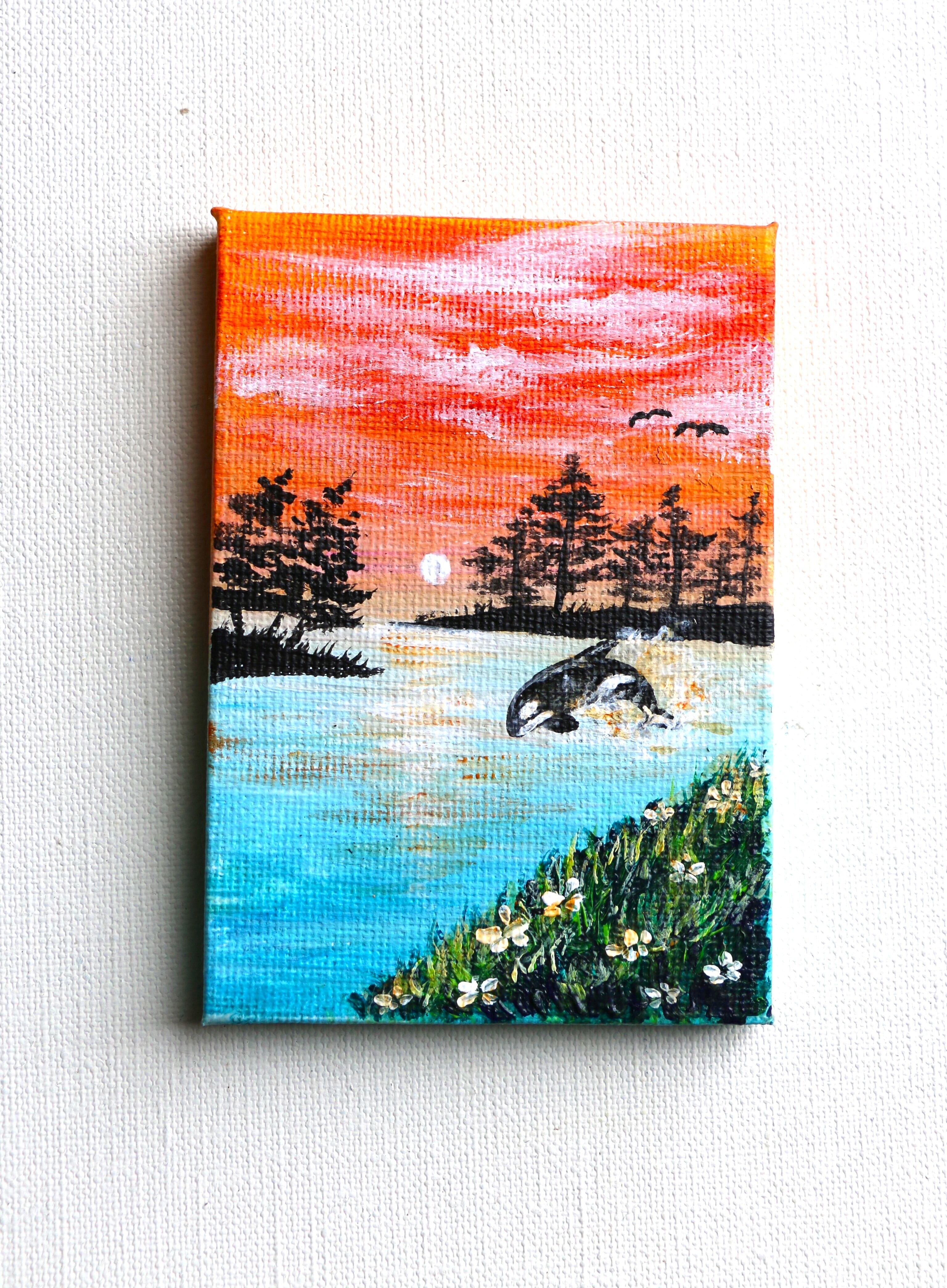 夕焼けを背景にジャンプするシャチ(ミニキャンバス)