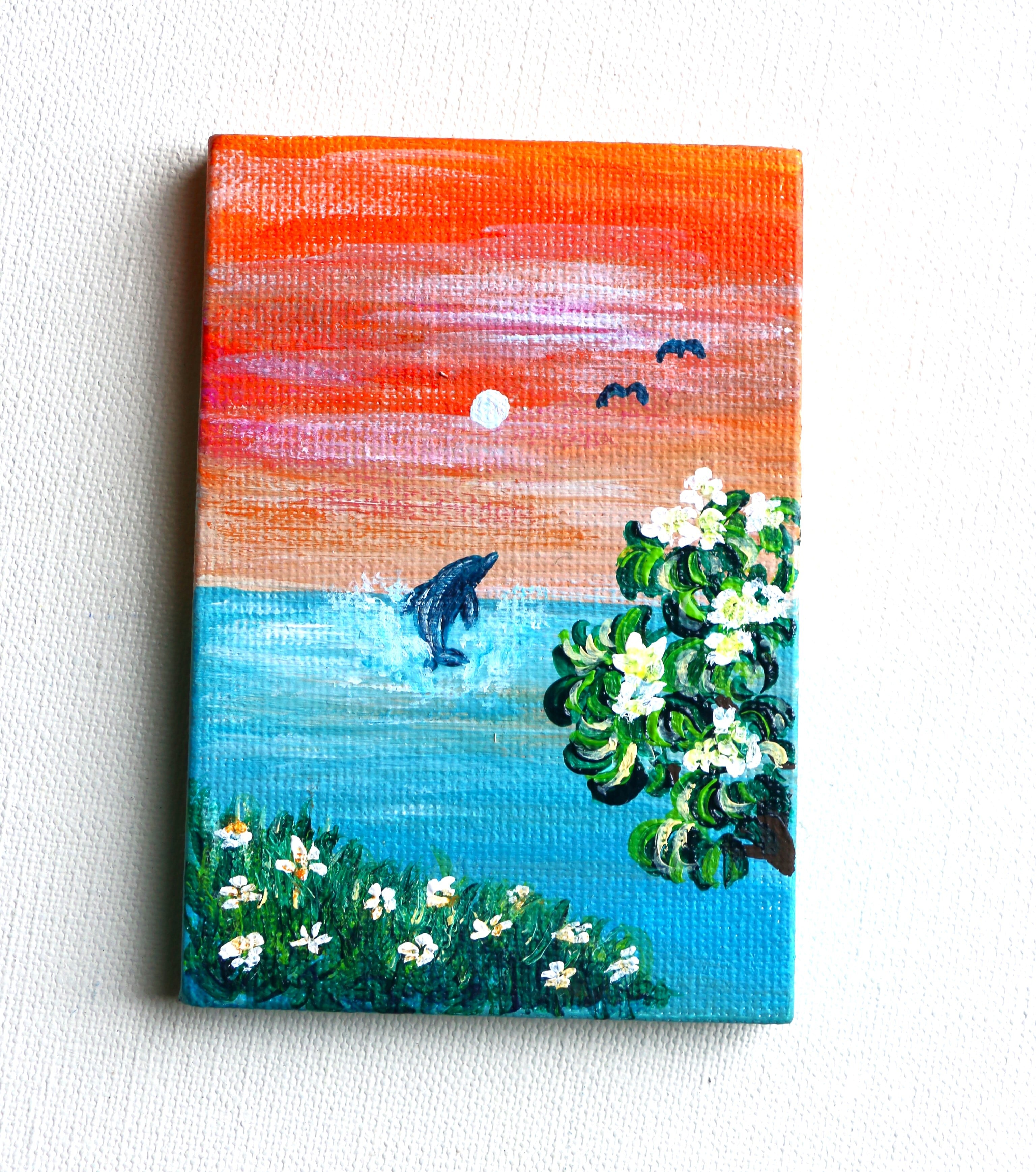 プルメリアとイルカ~夕日を背景に~(ミニキャンバス)