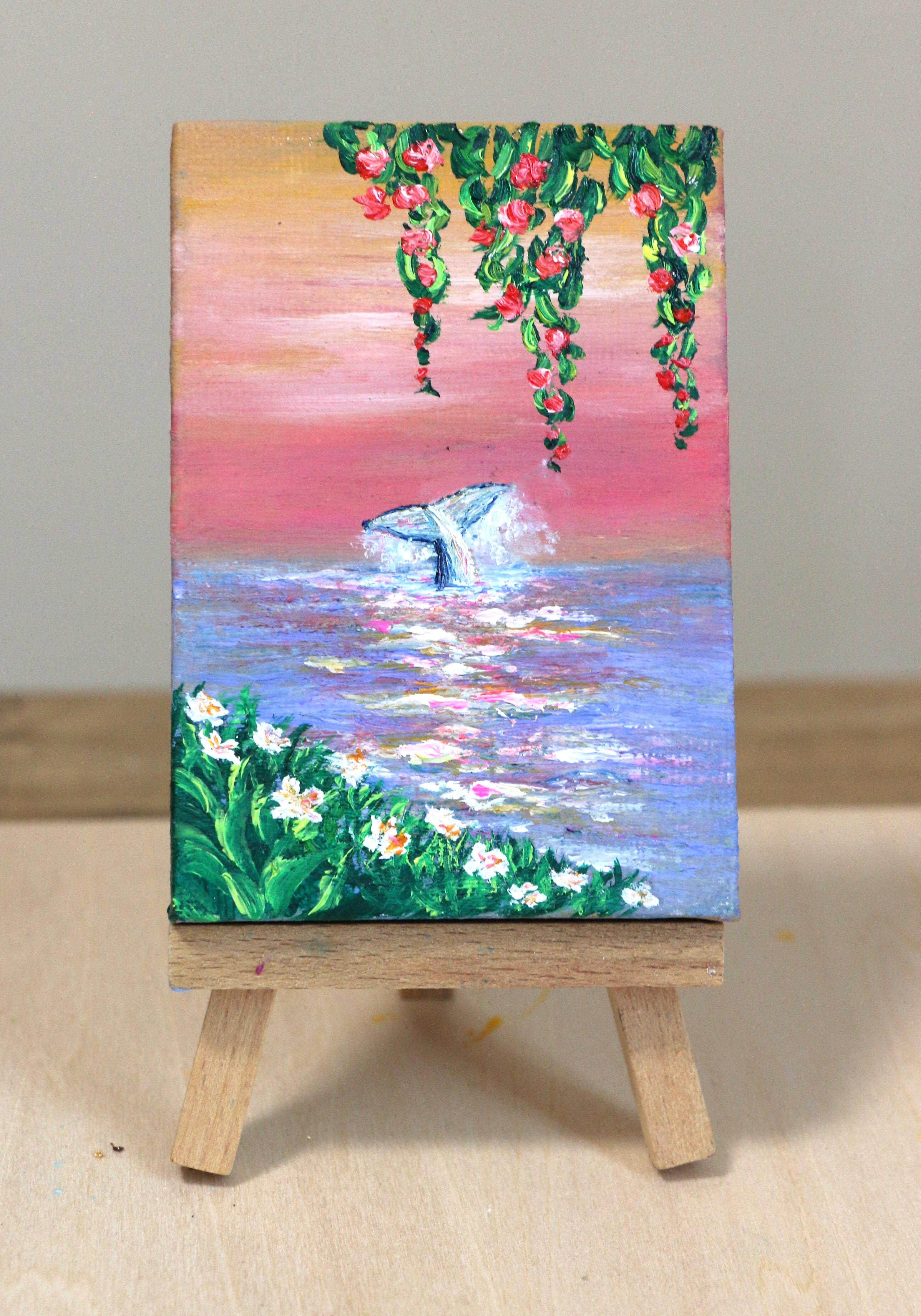手のひらサイズのミニ原画(10センチ×7センチ)です。油彩絵具とキャンバスを使用しています。作品表面はニスでコーティングしています。