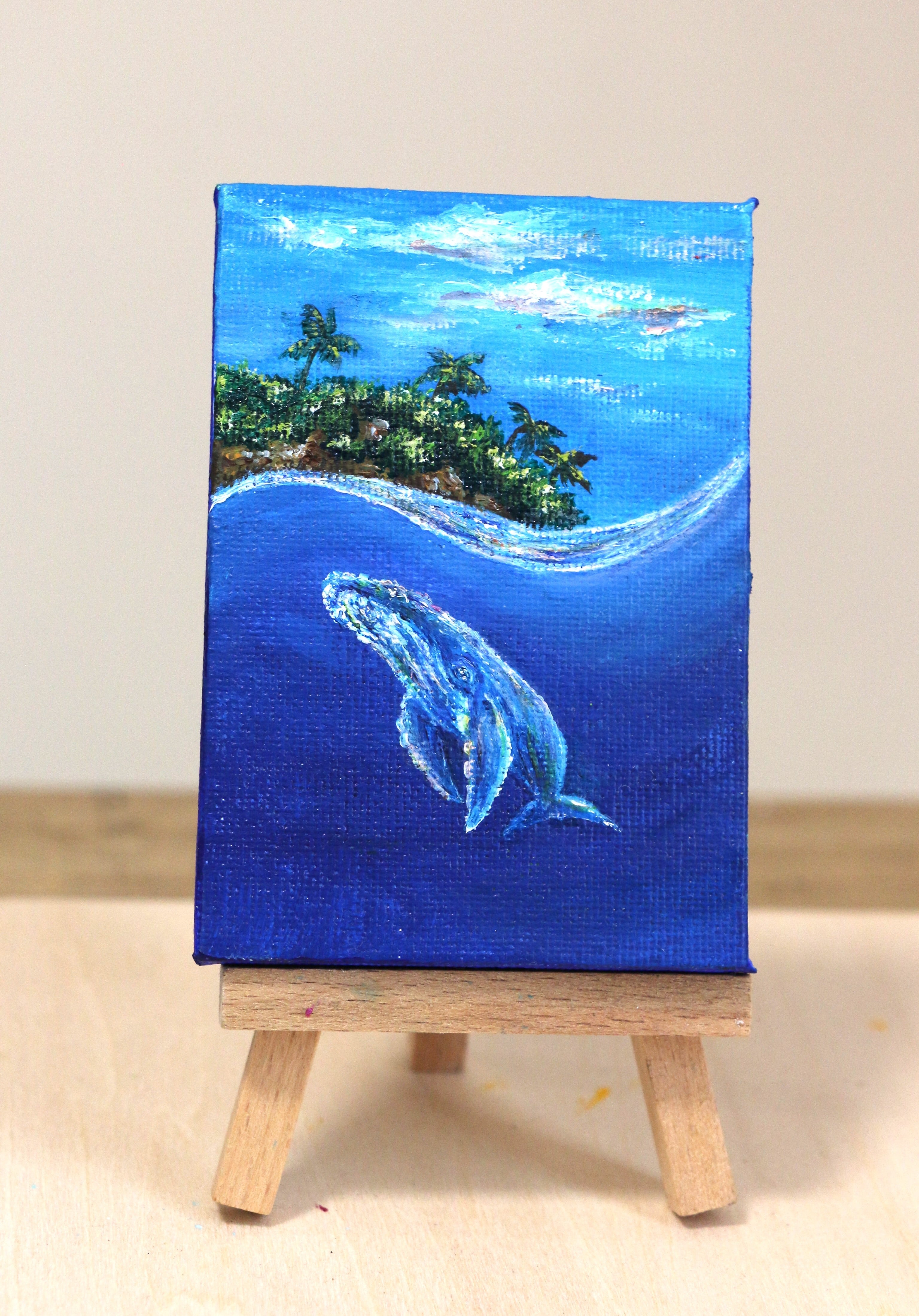 手のひらサイズのミニ原画(10センチ×7センチ)です。油彩絵具とキャンバスを使用しています。作品表面はニスでコーティングしています。