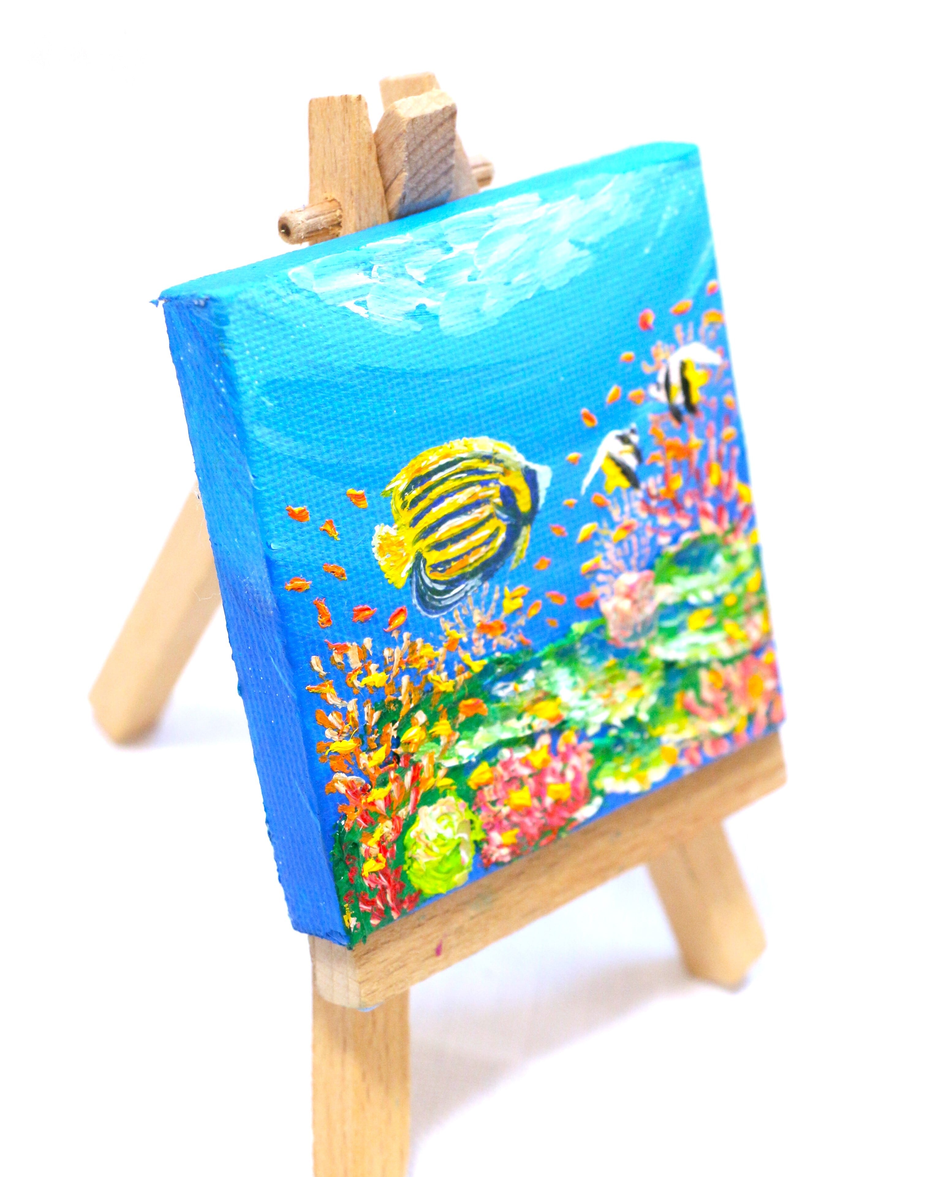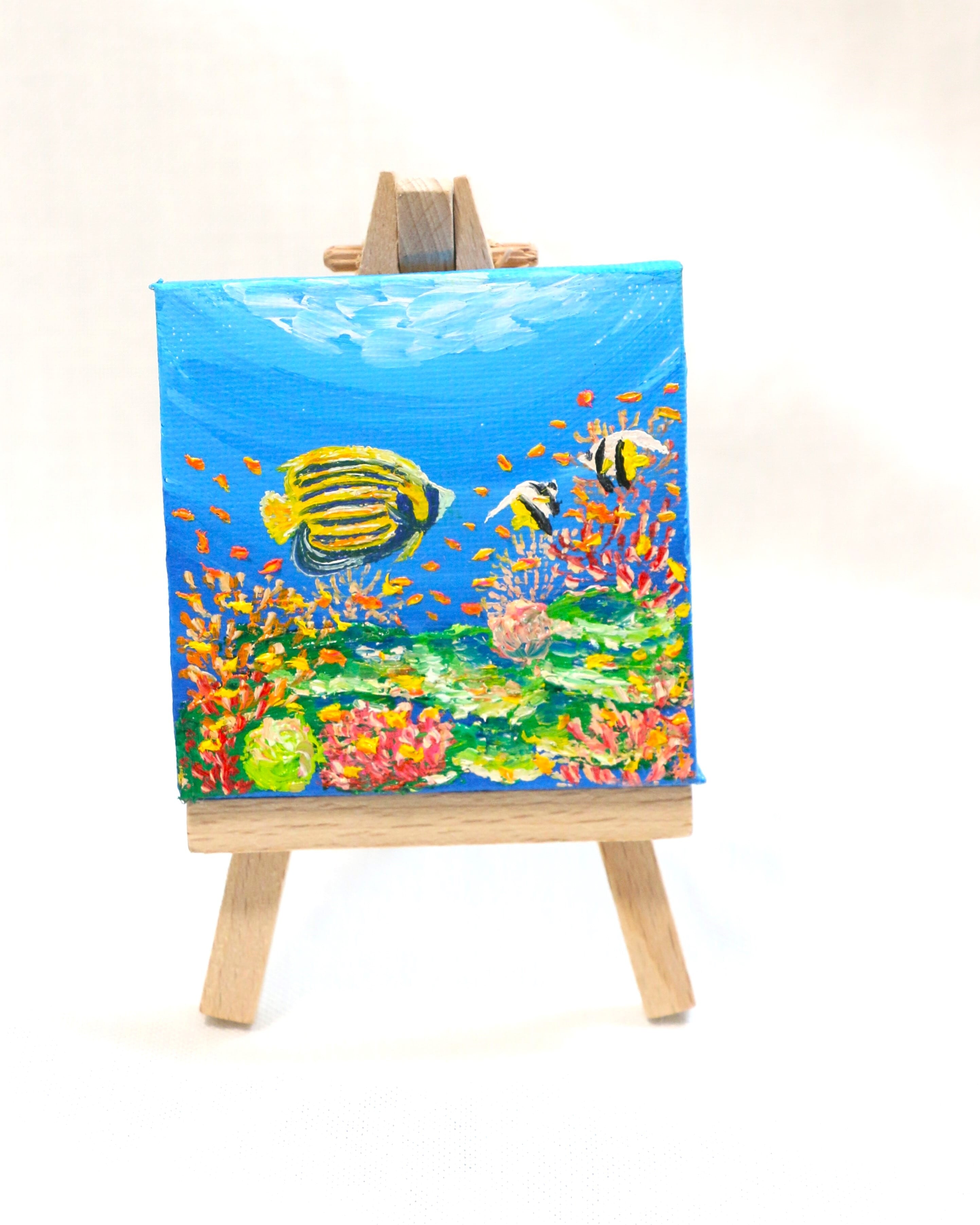 手のひらサイズのミニ原画(7センチ×7センチ)です。画材は油彩絵具、アクリル絵具、キャンバスを使用。作品表面はニスでコーティングしています。※ミニイーゼルは別売りです。