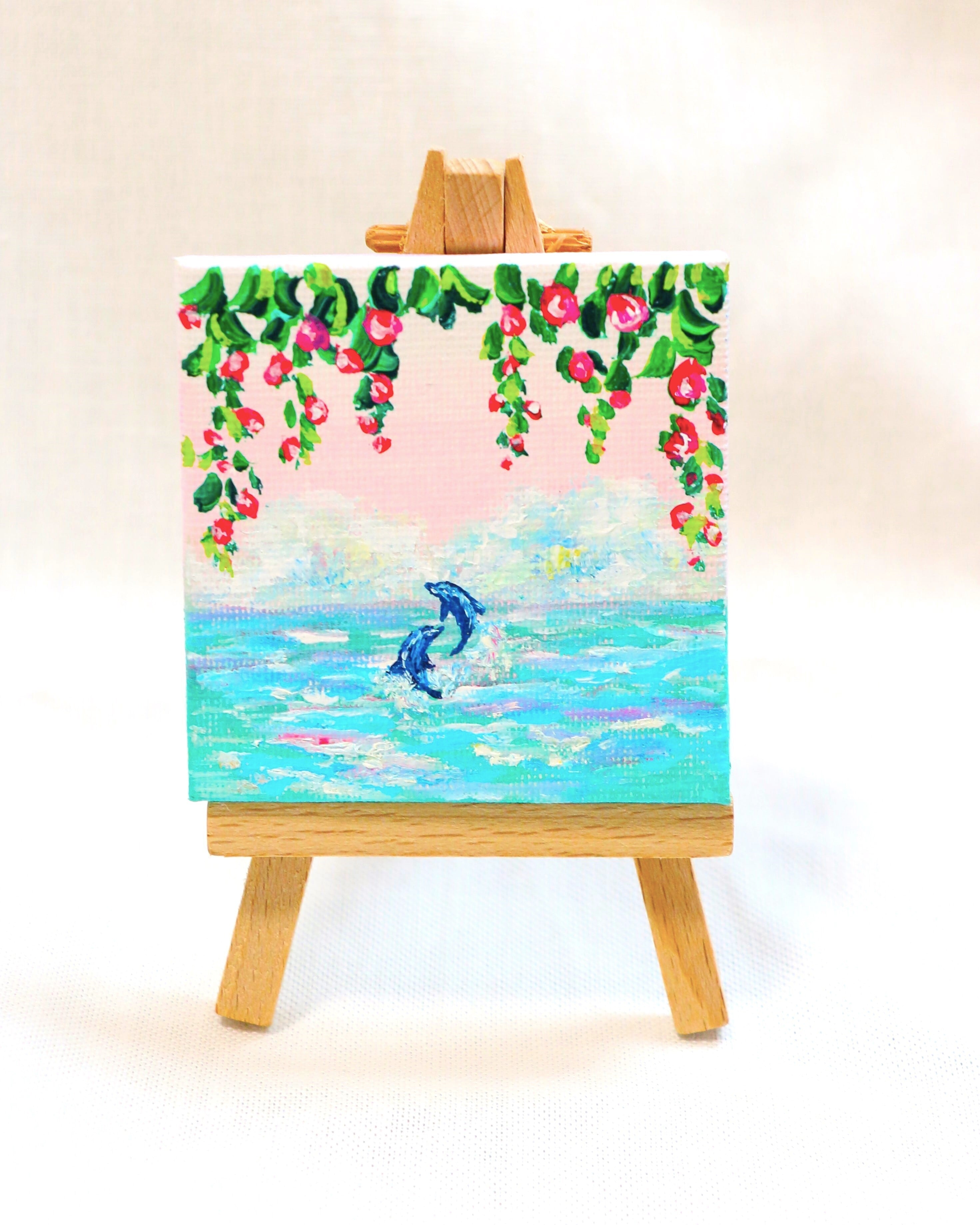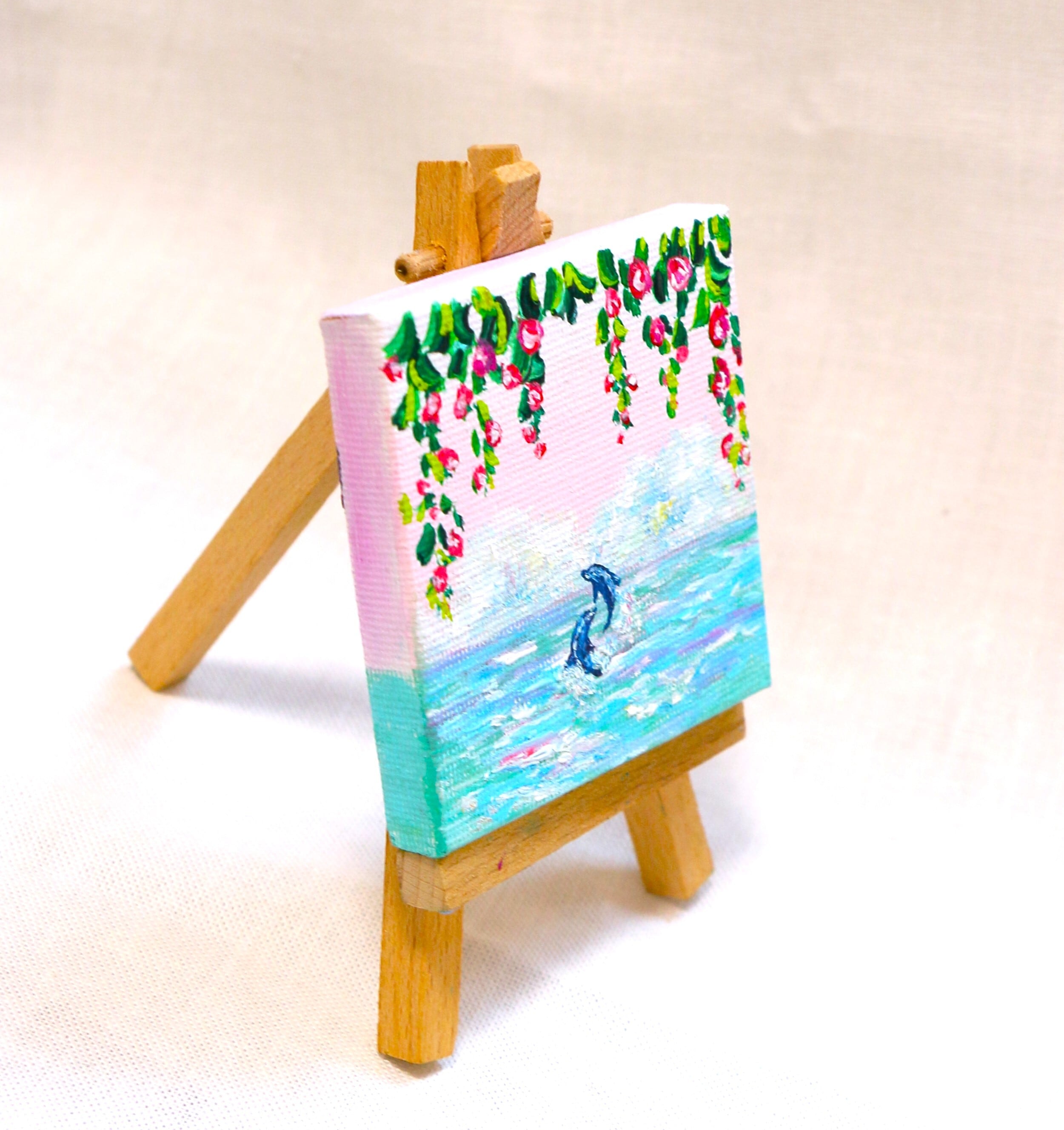 手のひらサイズのミニ原画(7センチ×7センチ)です。画材は油彩絵具、アクリル絵具、キャンバスを使用。作品表面はニスでコーティングしています。※ミニイーゼルは別売りです。