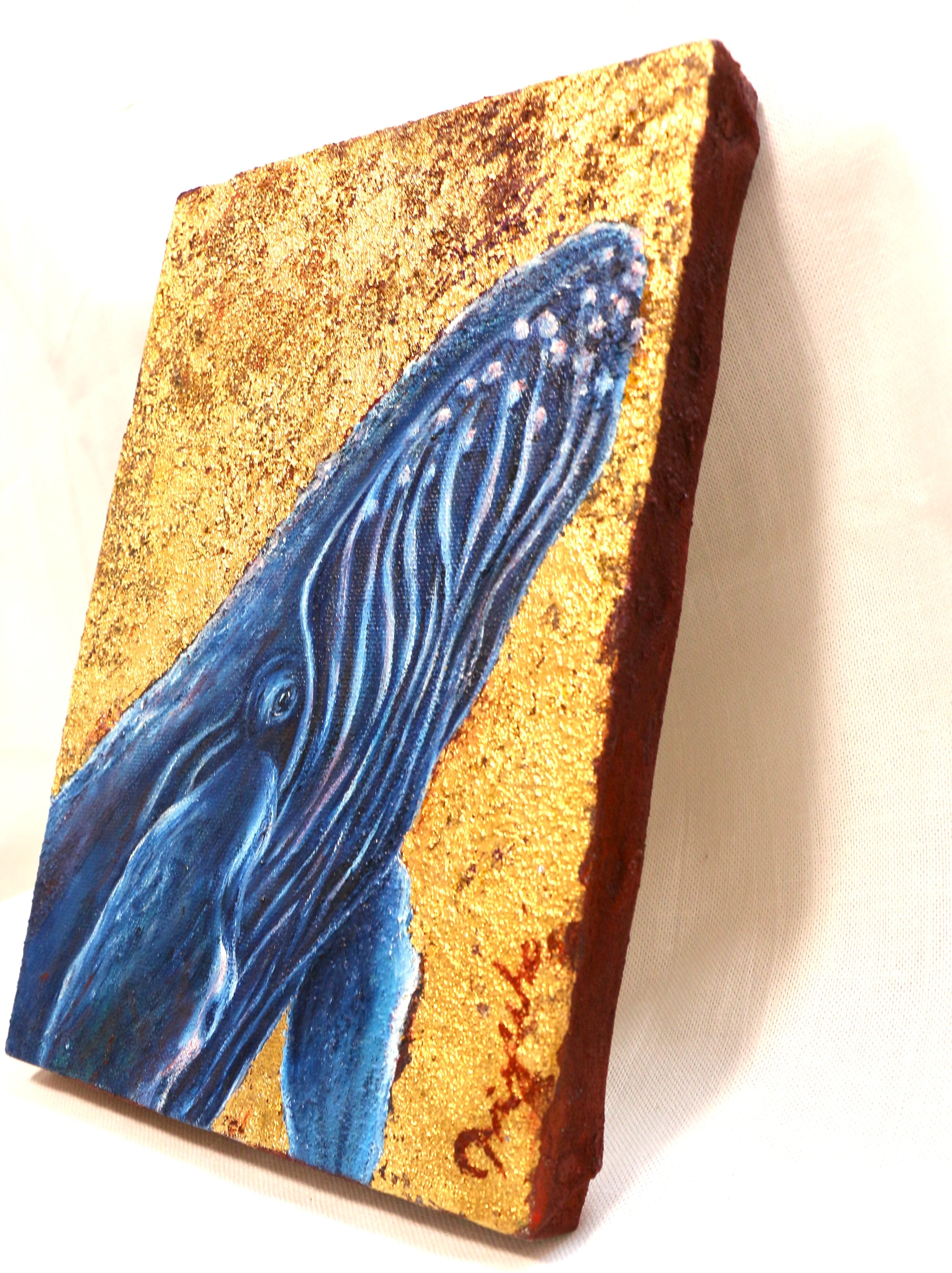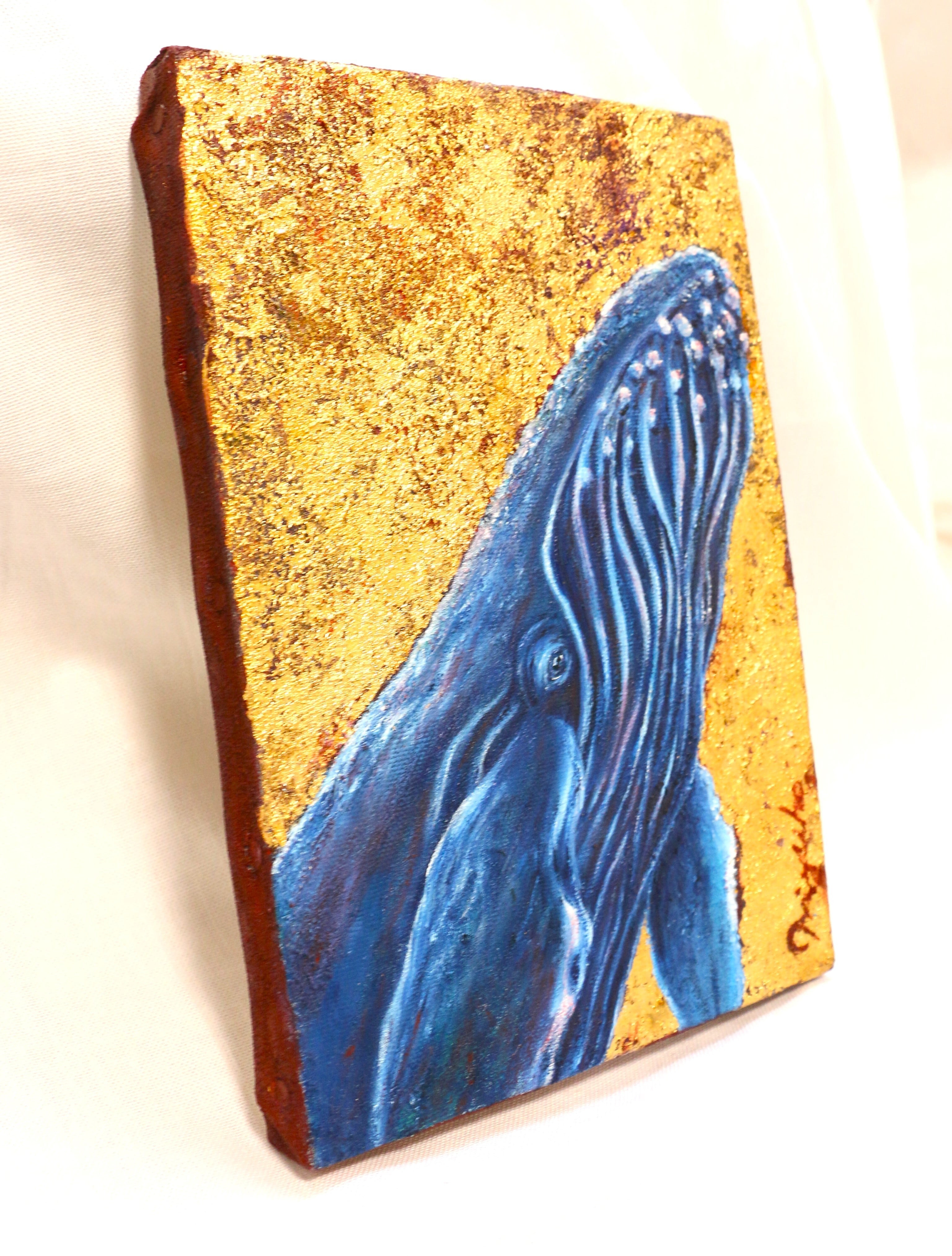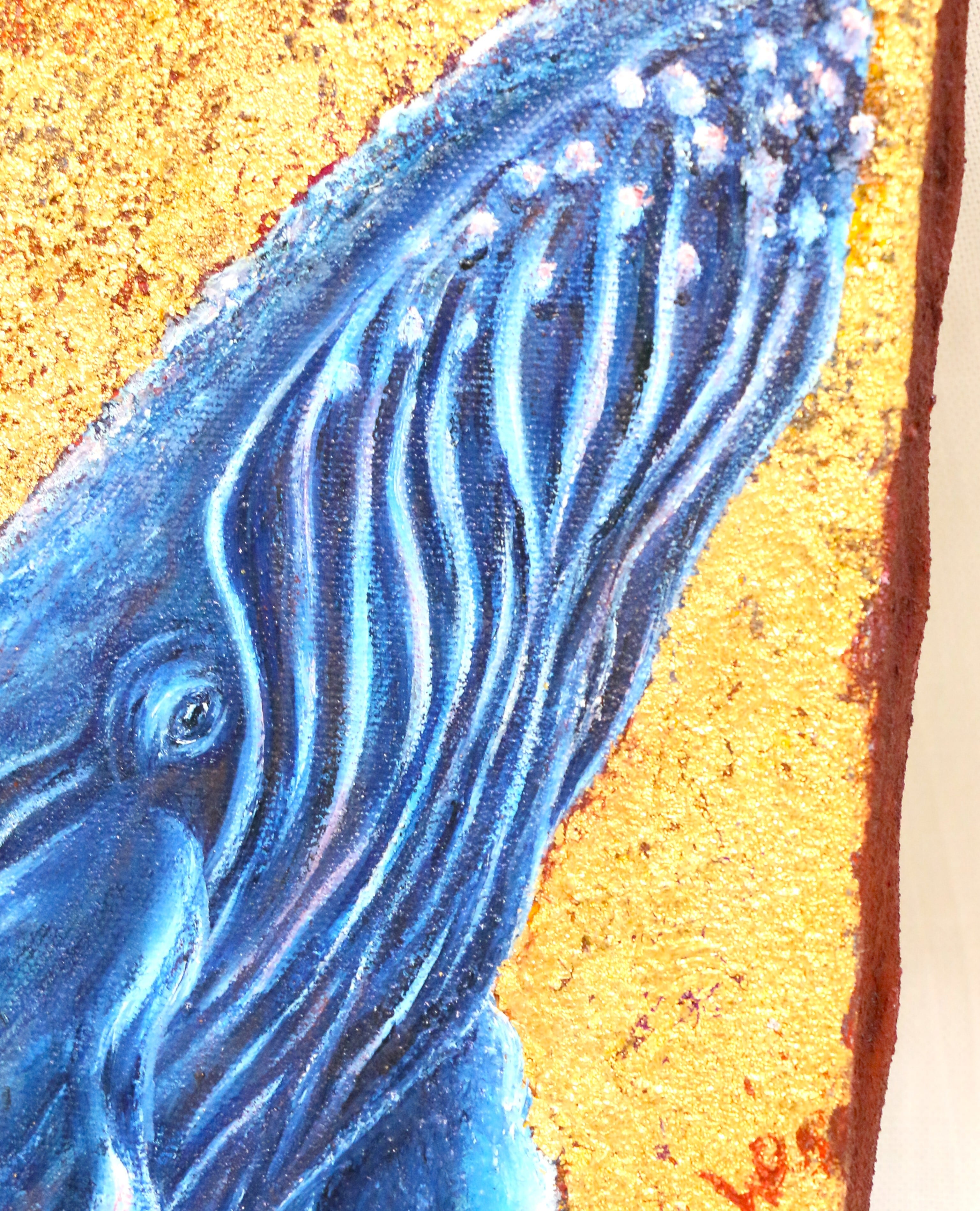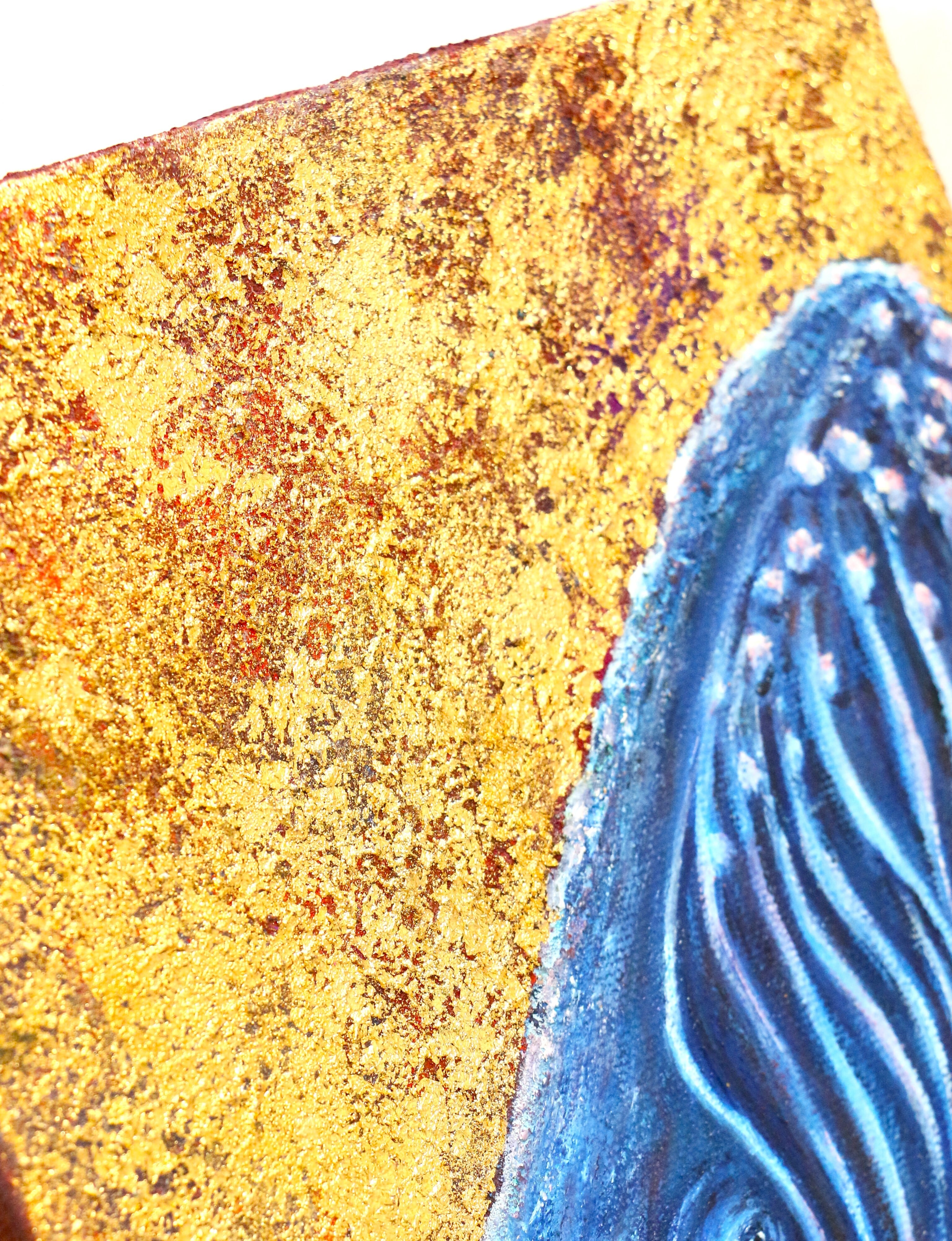 青い体が引き立つよう背景に金を使い、存在感を強調しました。ざらざらした金の隙間からのぞく赤は、クジラの身体の深い青色とのコントラストを生みつつ、クジラの体内を流れる血液を表現しています。赤は命の色。巨大な存在が、今も静かに“生きている”ことを改めて示しました。