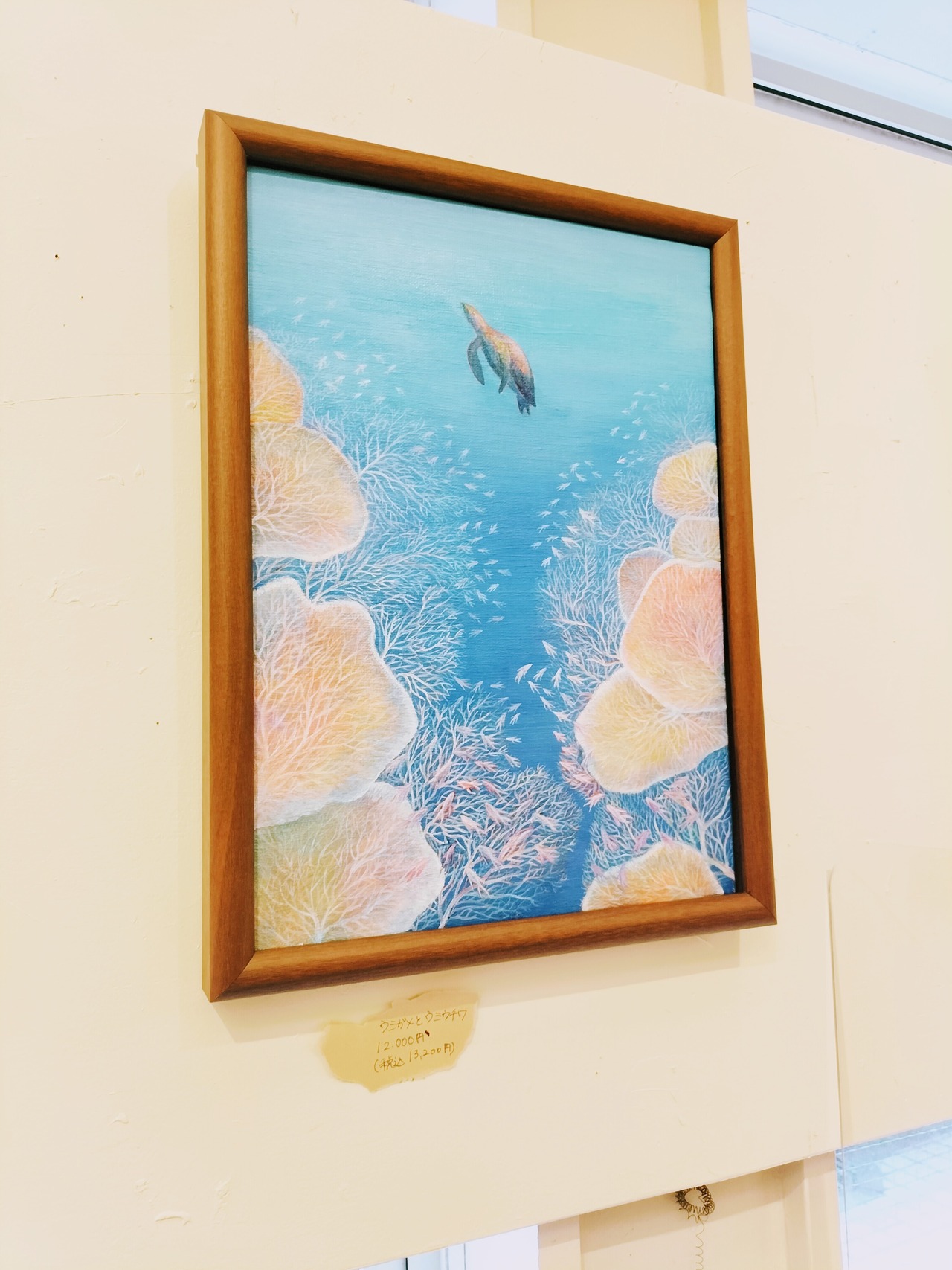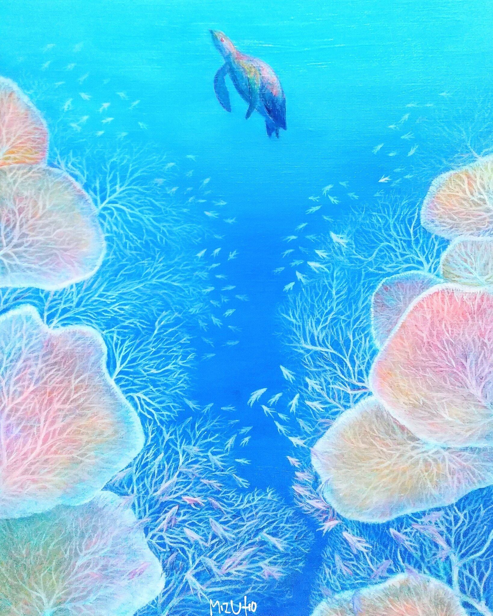 タイトル:珊瑚の中を泳ぐアオウミガメ